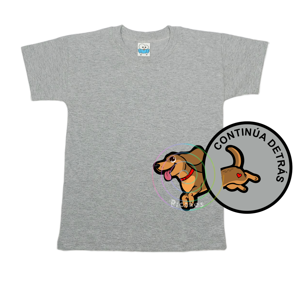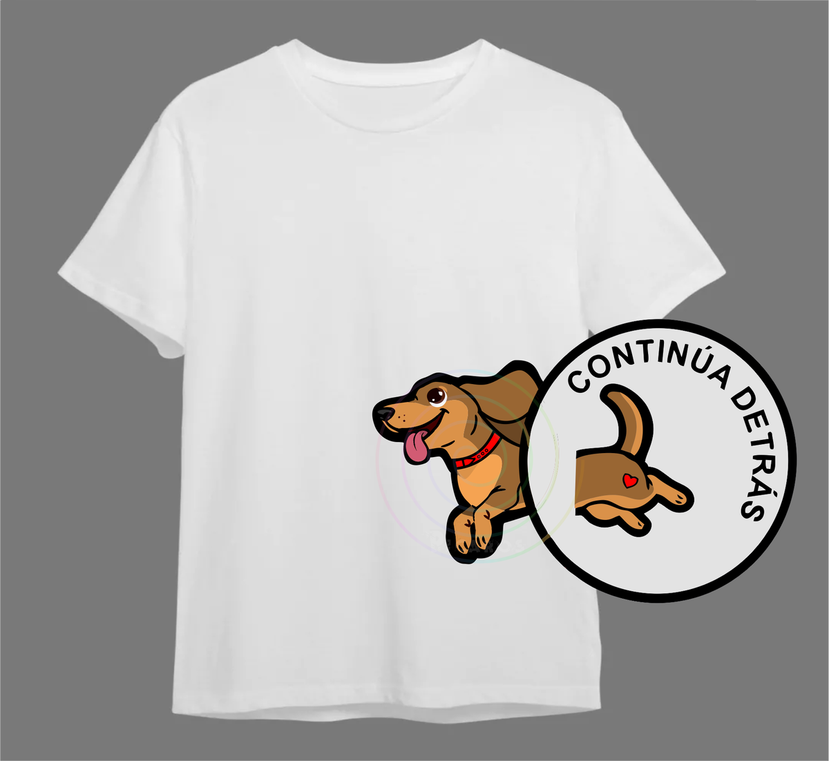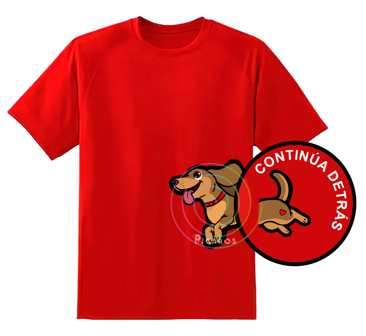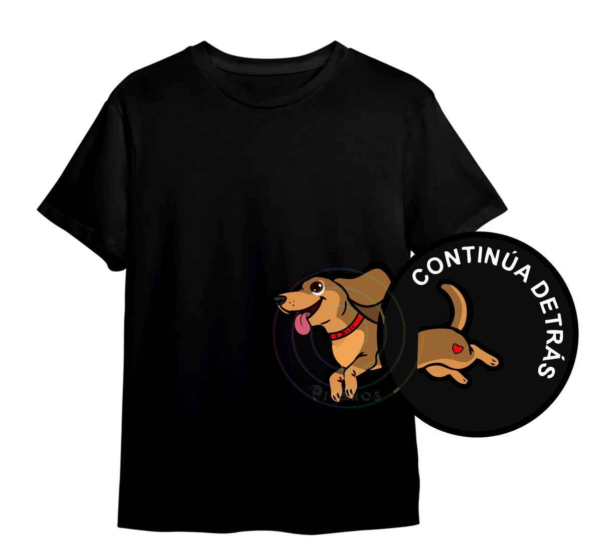 DISEÑO DE PERRO SALCHICHA QUE EMPIEZA EN EL FRENTE DE LA REMERA Y TERMINA POR LA ESPALDA