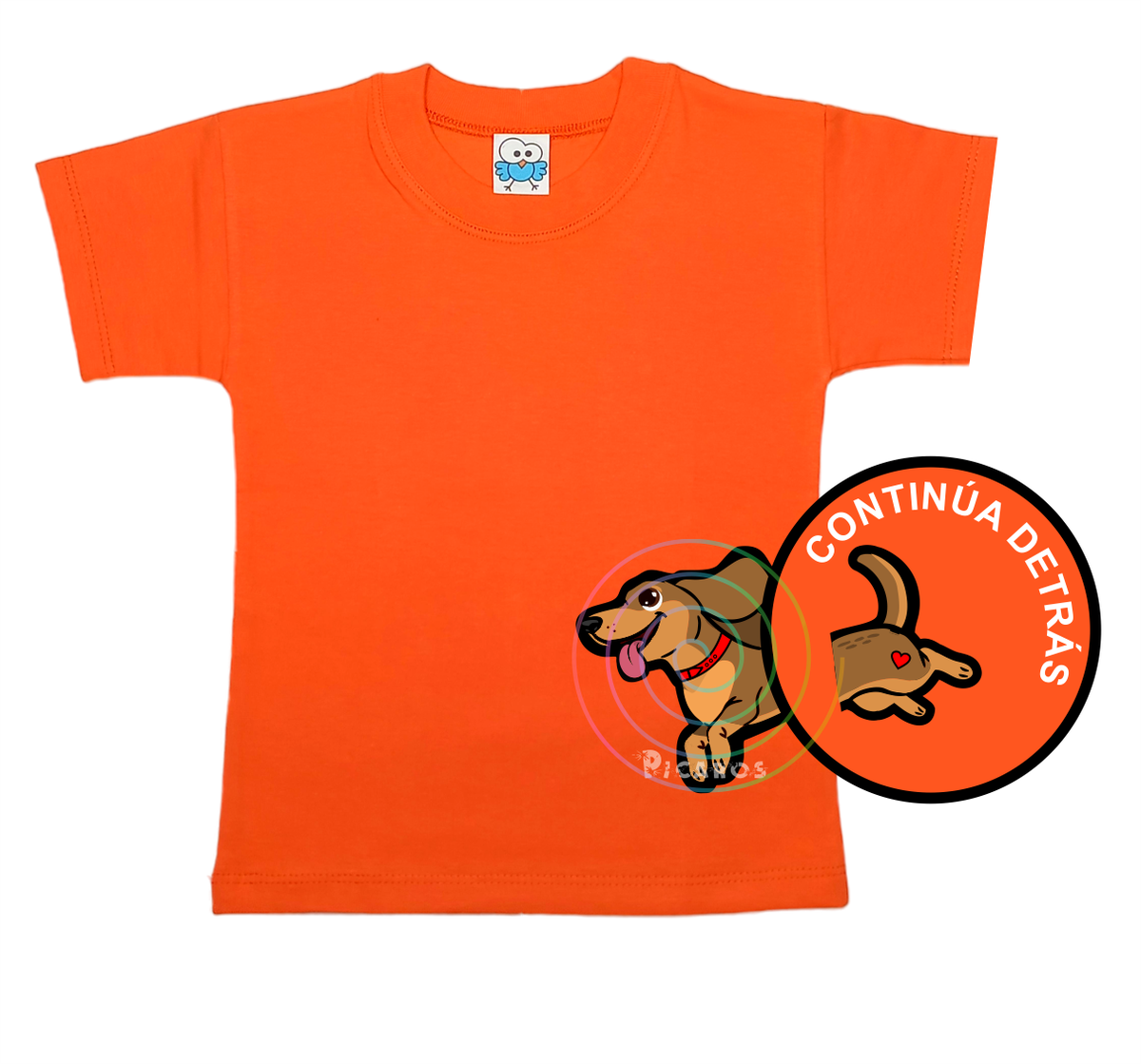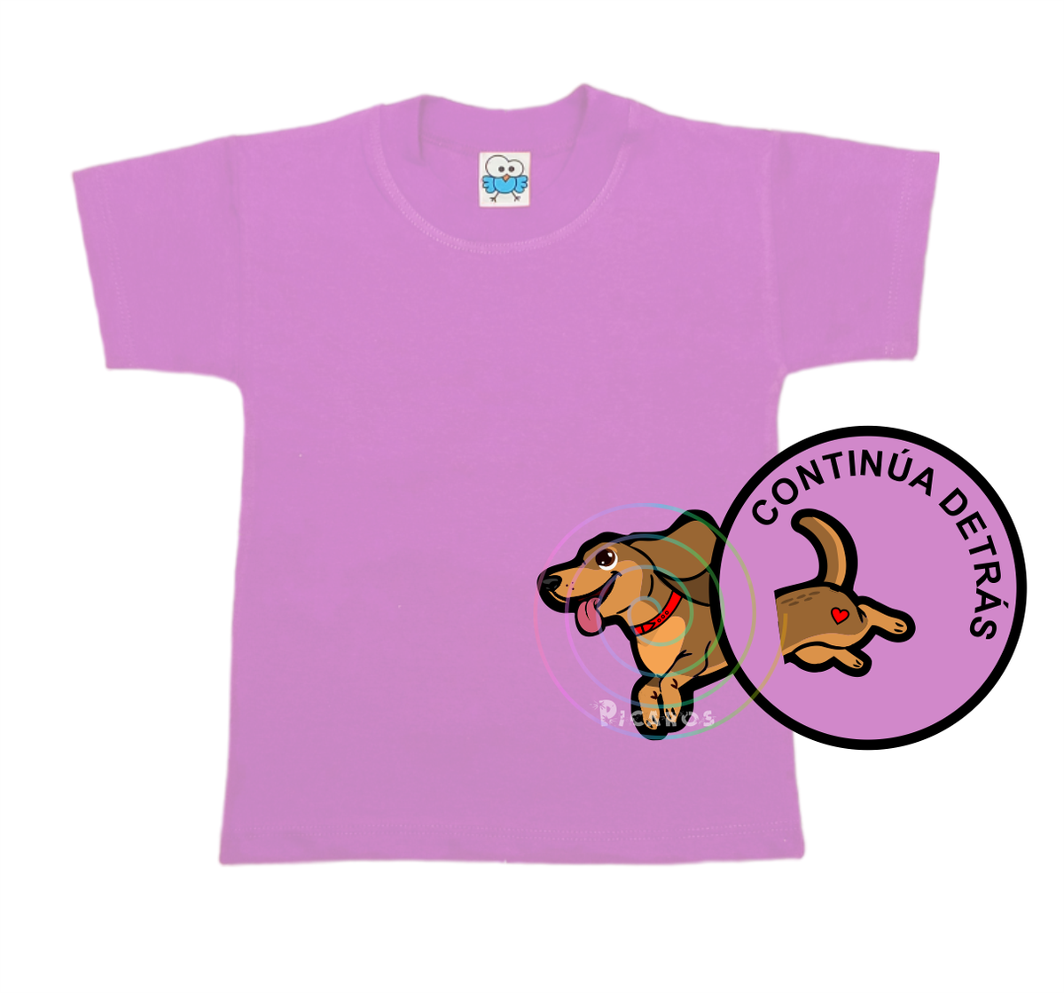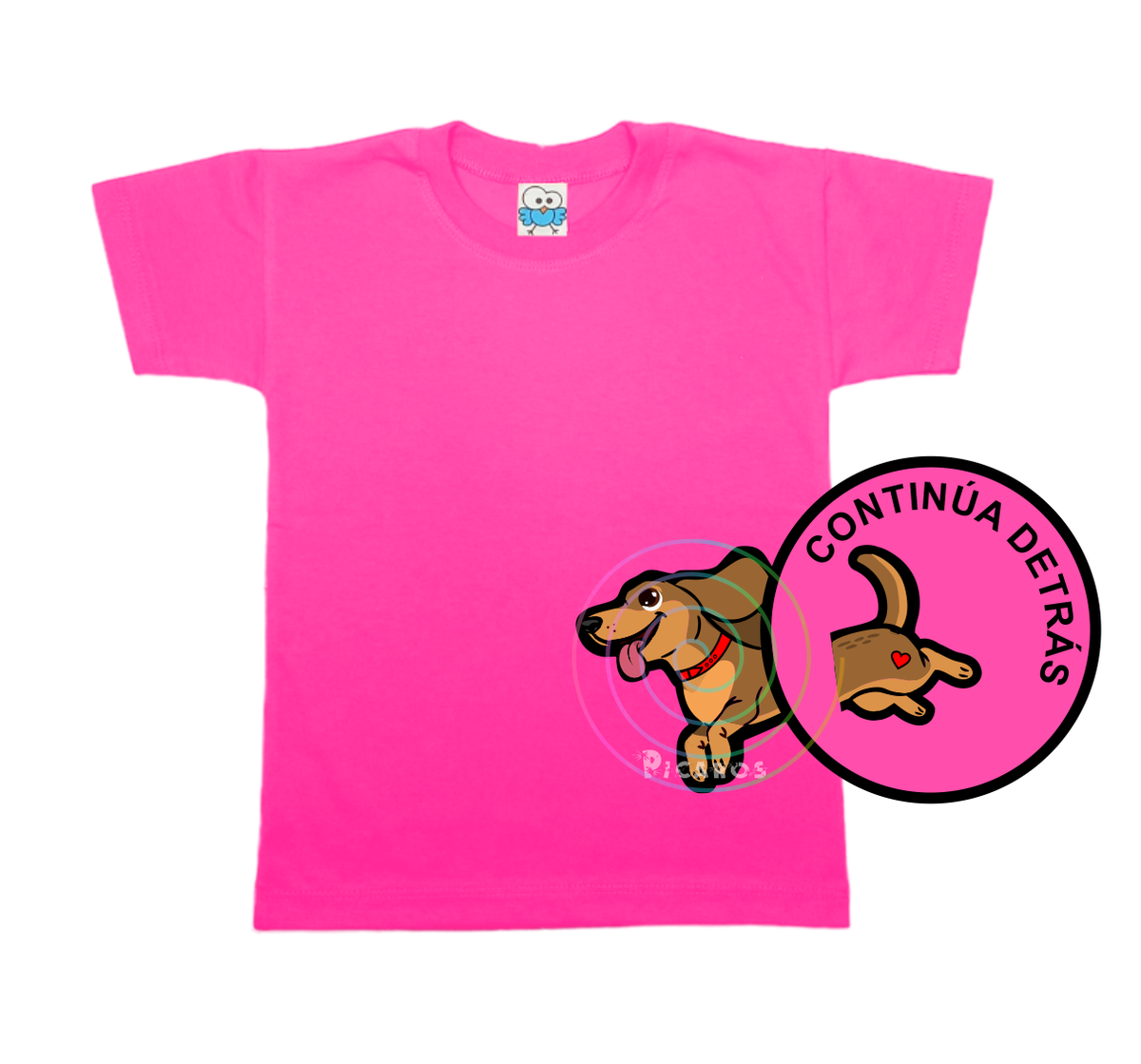 DISEÑO DE PERRO SALCHICHA QUE EMPIEZA EN EL FRENTE DE LA REMERA Y TERMINA POR LA ESPALDA