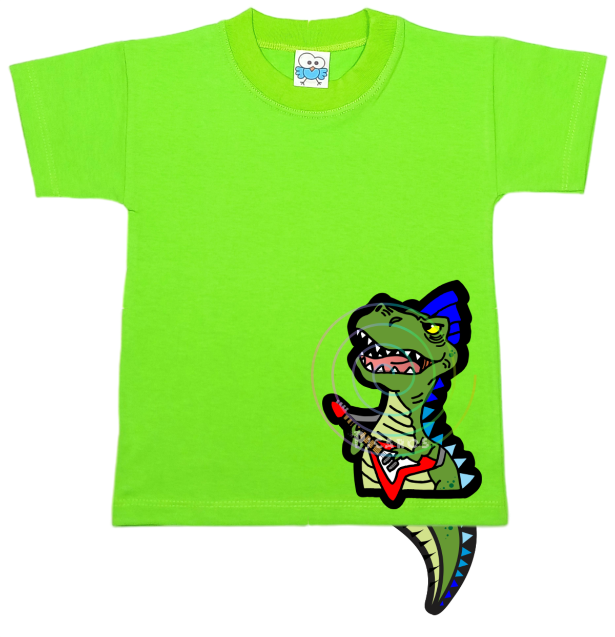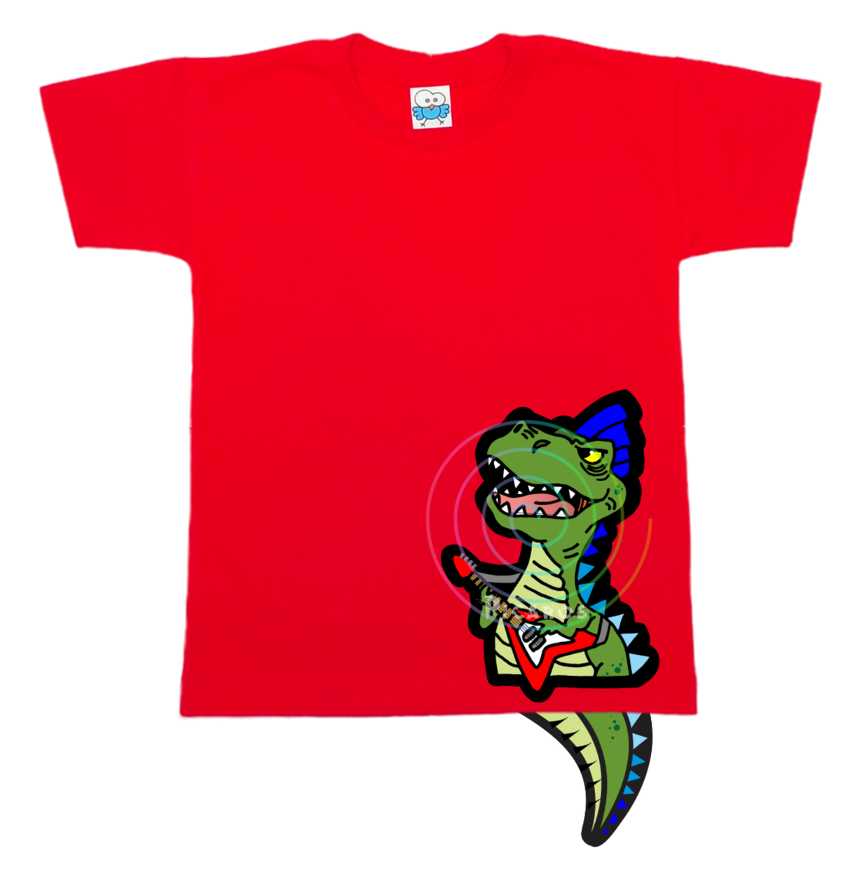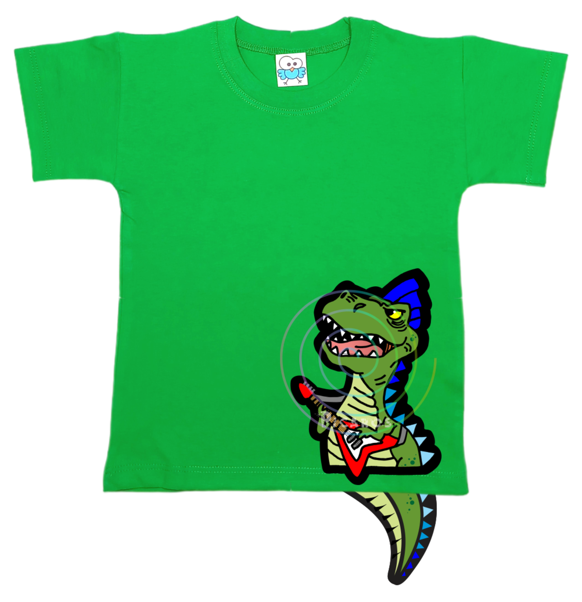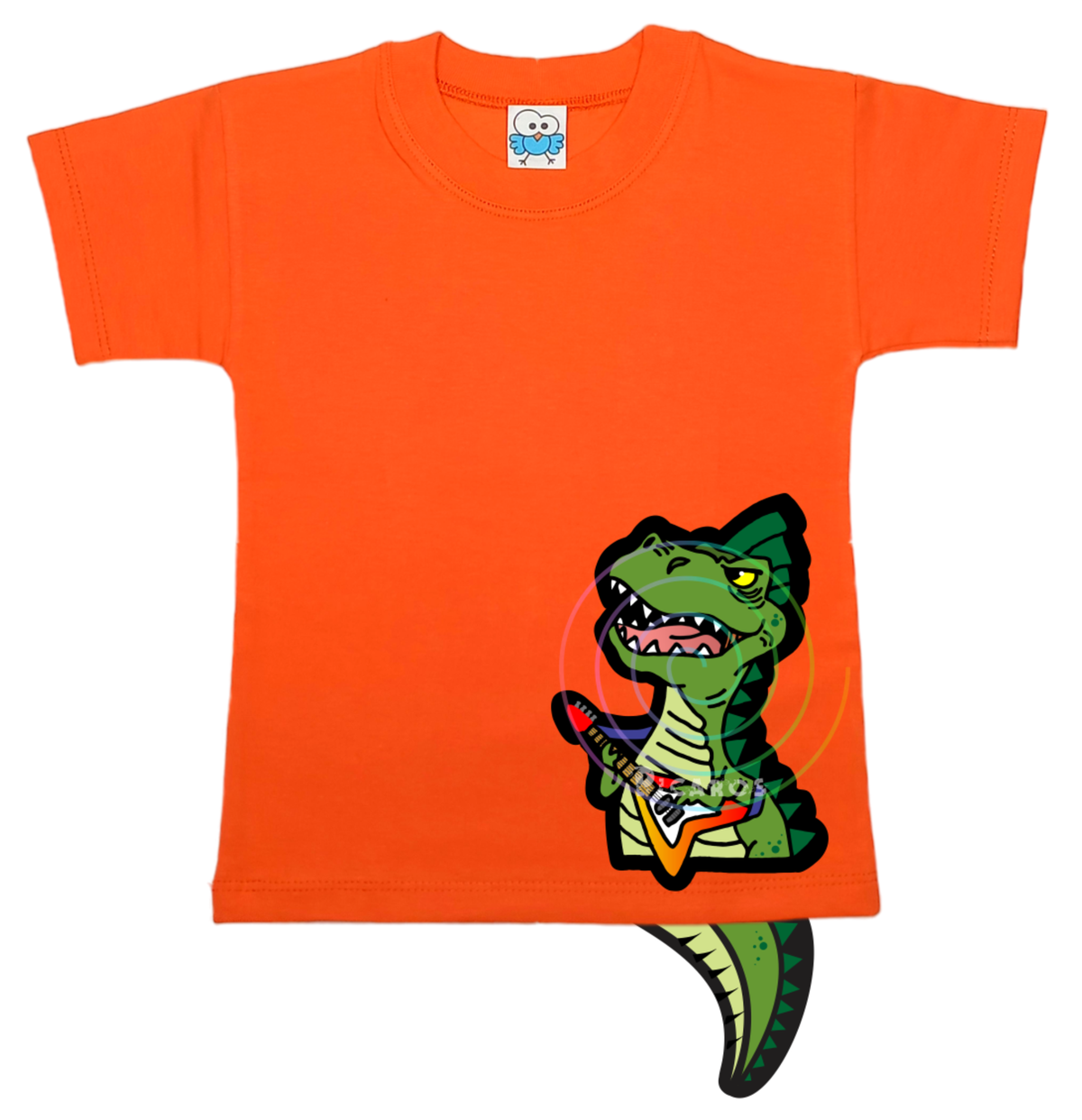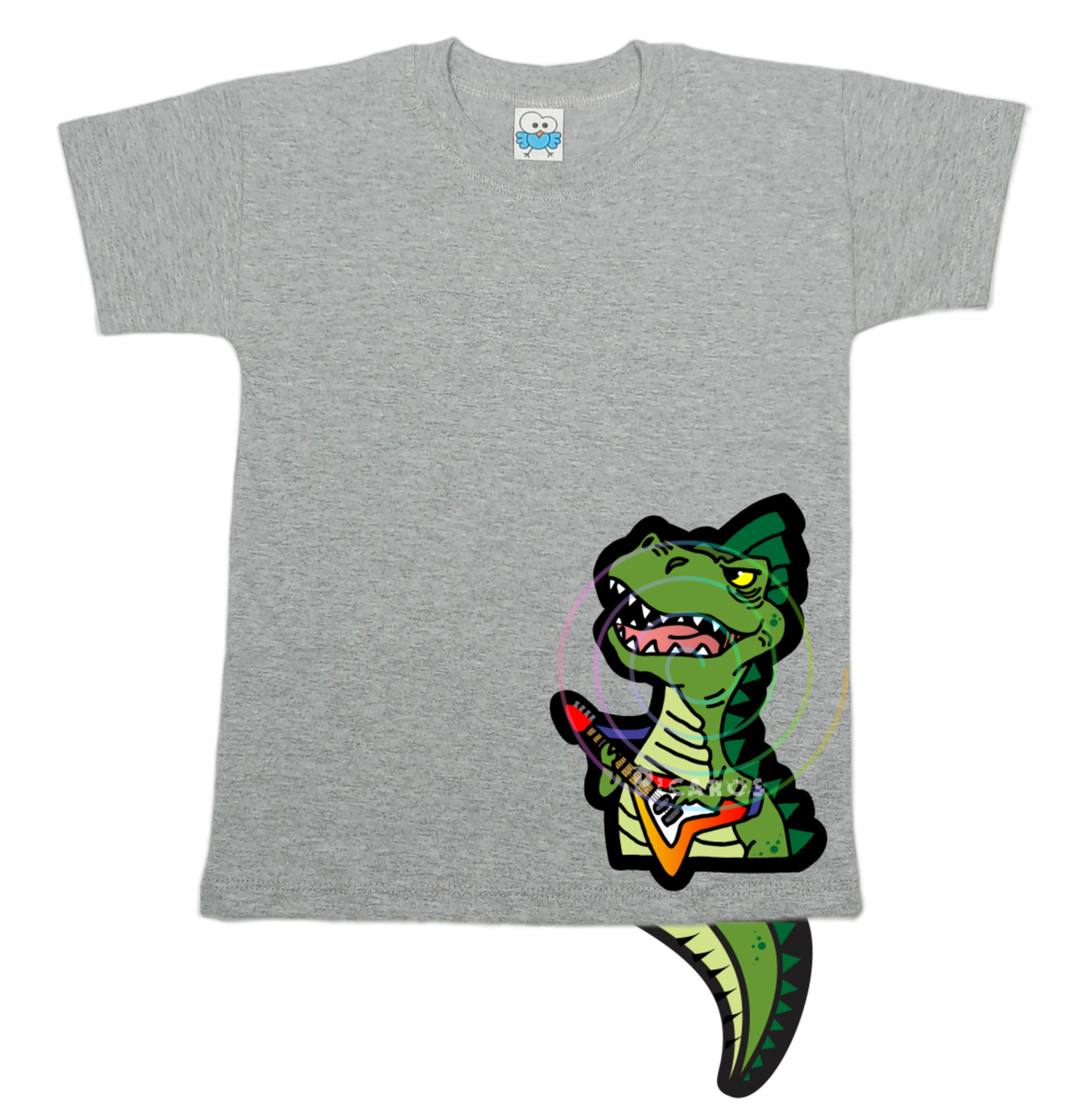 DISEÑO DE DINO ROCKERO CON COLITA QUE SOBRESALE DE LA REMERA