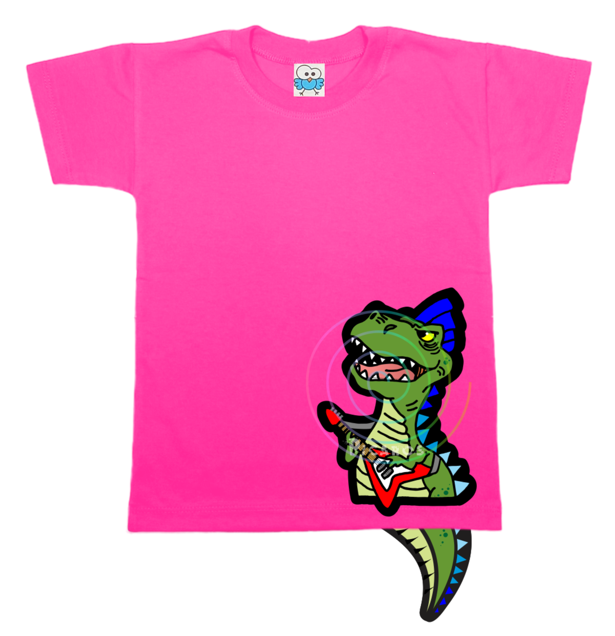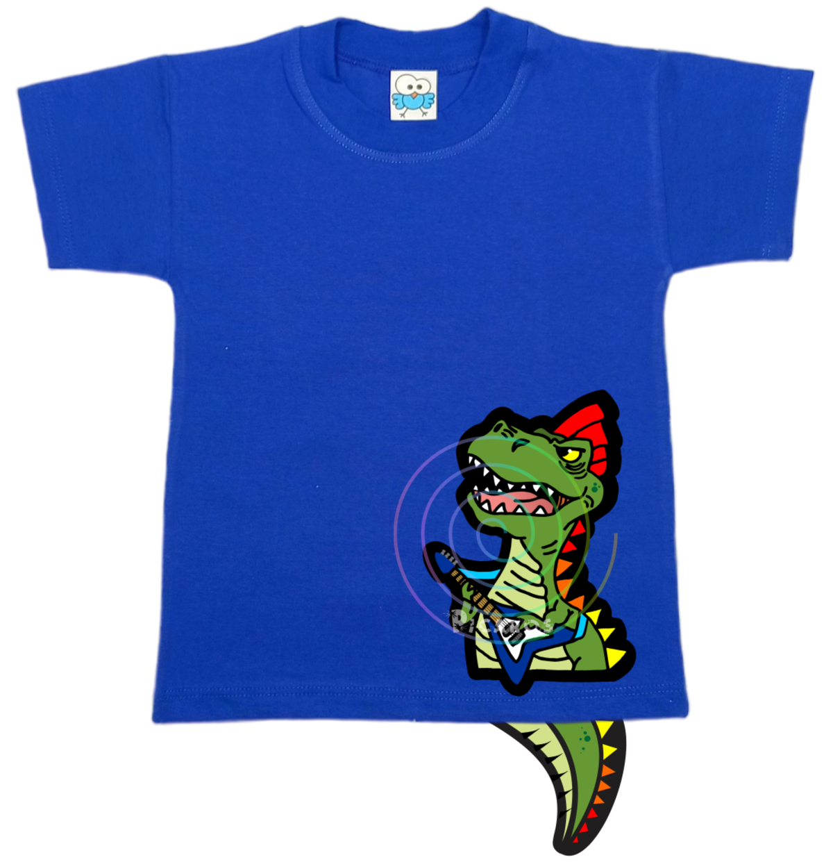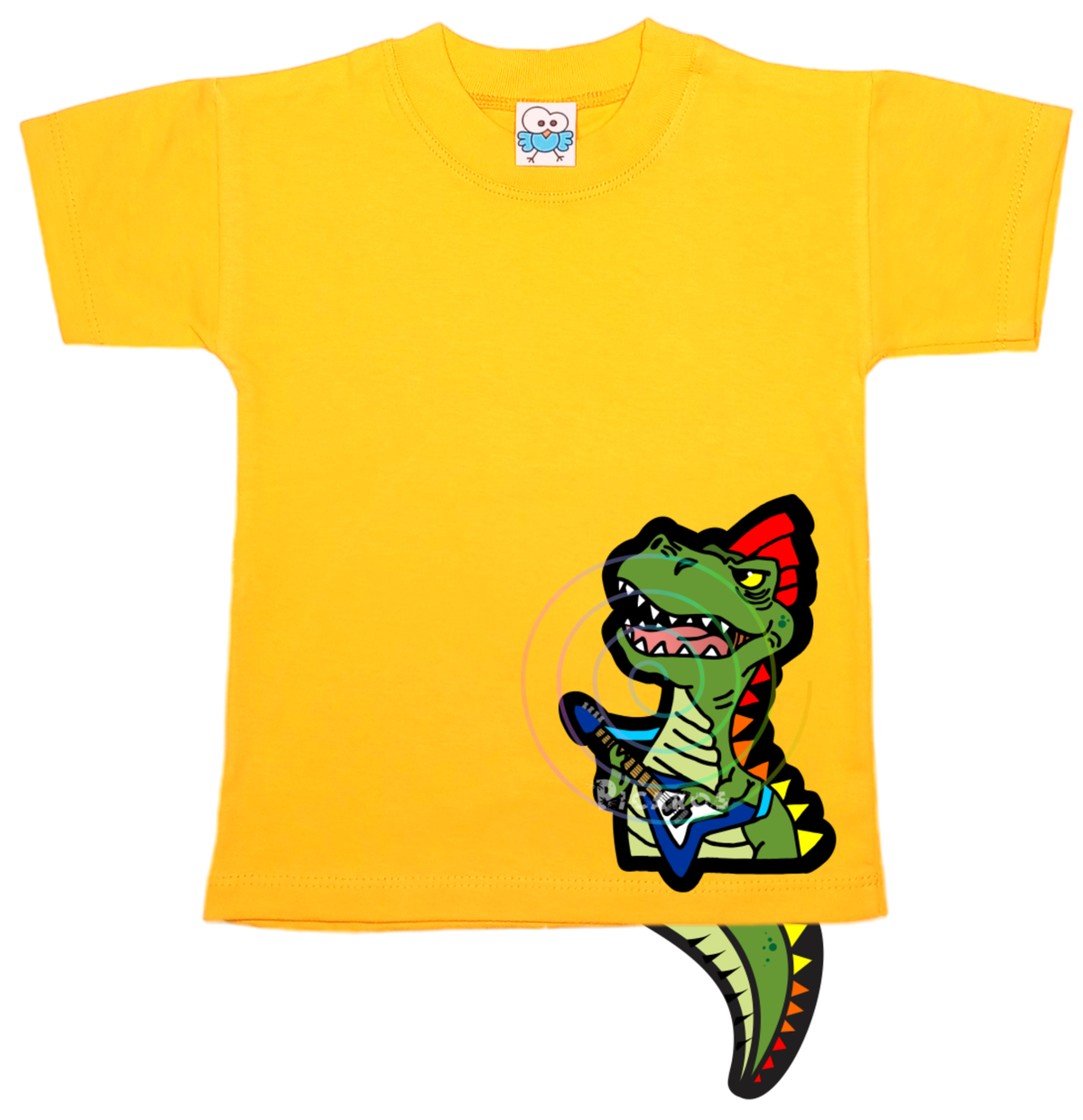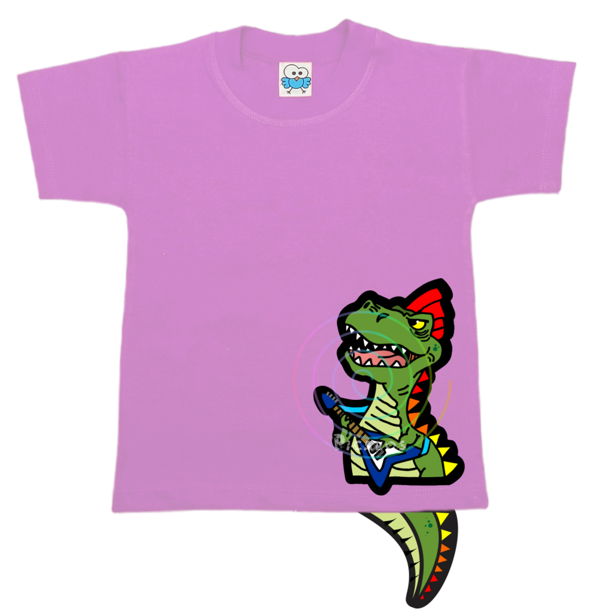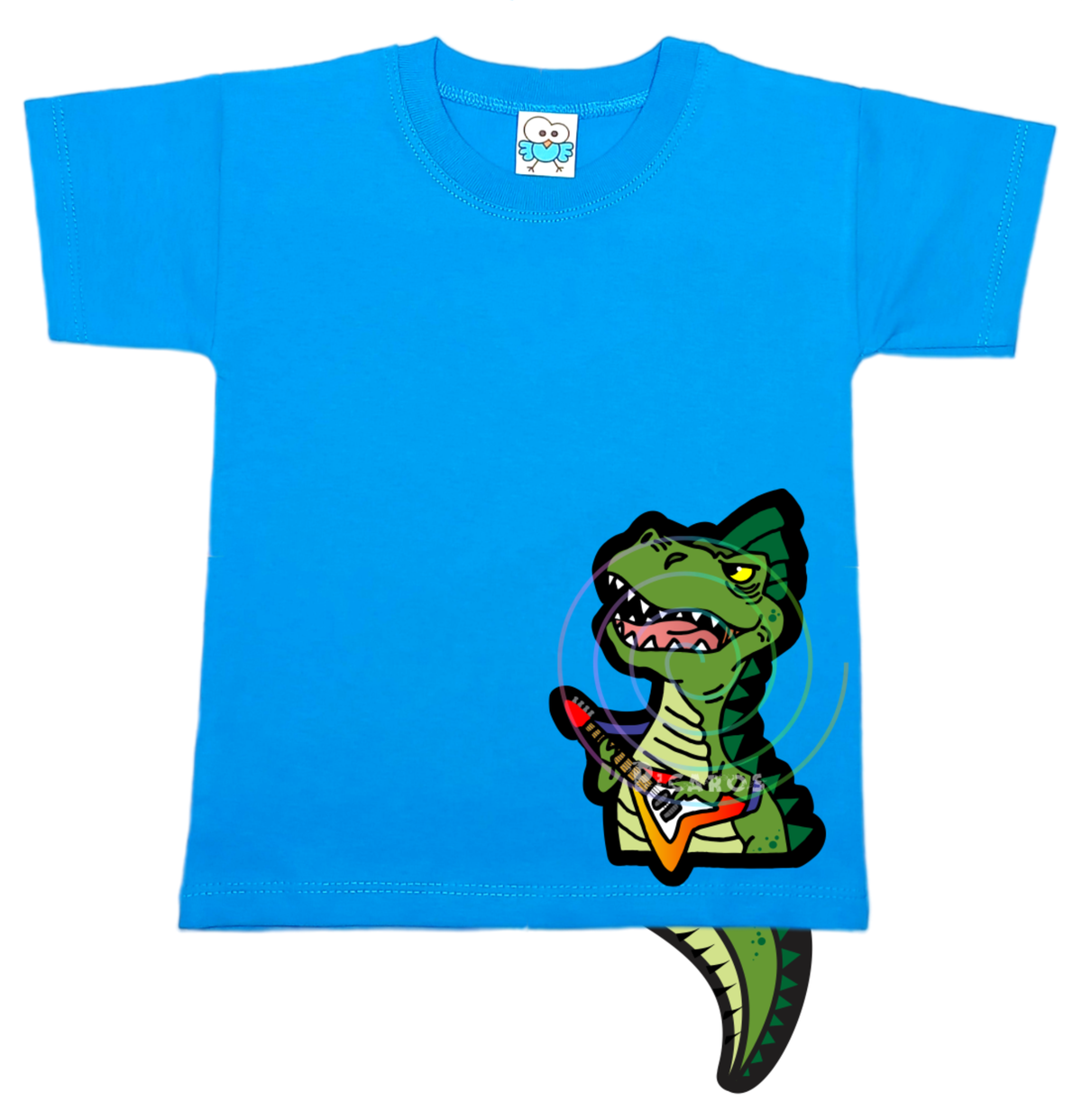 DISEÑO DE DINO ROCKERO CON COLITA QUE SOBRESALE DE LA REMERA